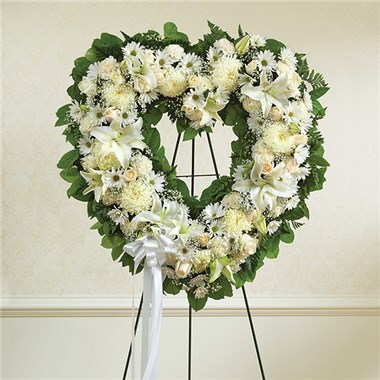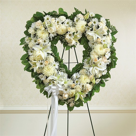 The enduring love you feel for them will keep them always remembered. This sentiment is best captured with our standing, open heart-shaped arrangement in all white. Handcrafted by our caring florists with an assortment of flawless white blooms, it is a magnificent tribute fitting for the funeral services. •Open, heart-shaped arrangement of all white roses, hybrid lilies, football mums, carnations and daisy poms; accented with baby’s breath and soft, lush greenery •Arrangement is designed on an easel and accented with satin ribbon •Measures approximately 26"H x 28"W without easel •Appropriate for the funeral home •Our florists use only the freshest flowers available, so colors and varieties may vary